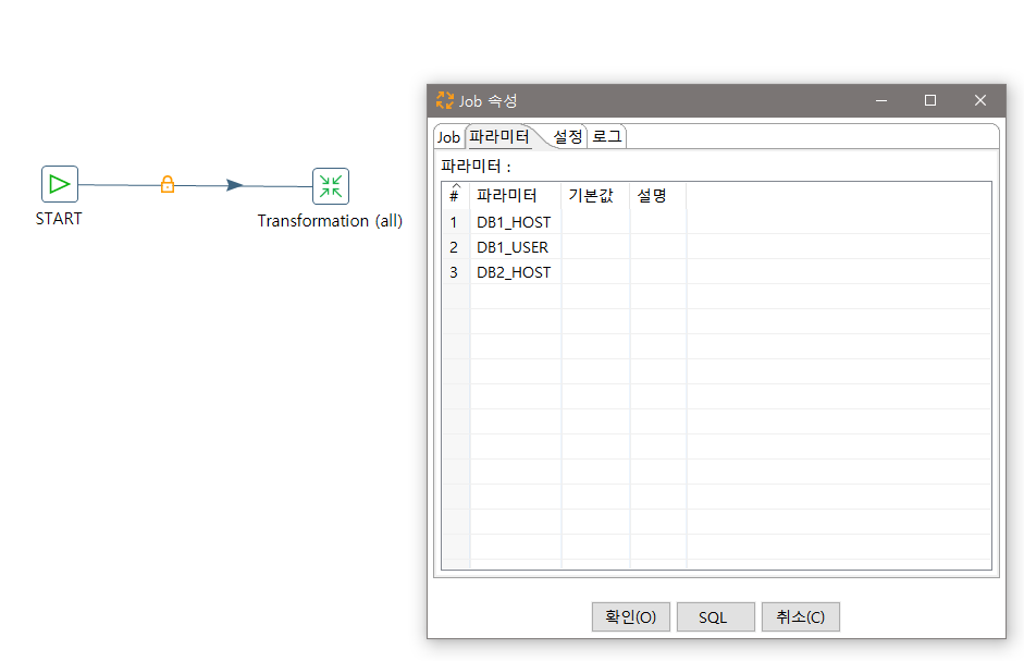 - 가장 먼저, JOB 파일의 속성으로 들어가 Parameter 항목으로 들어가 자신이 사용할 파라미터를 설정해 줍니다. 저는 DB를 연결하는 것이 2개가 있고, 하나는 HOST, USERNAME를, 나머지 하나는 HOST만 변수화 처리를 할 것이기에 아래와 같이 설정하였습니다.