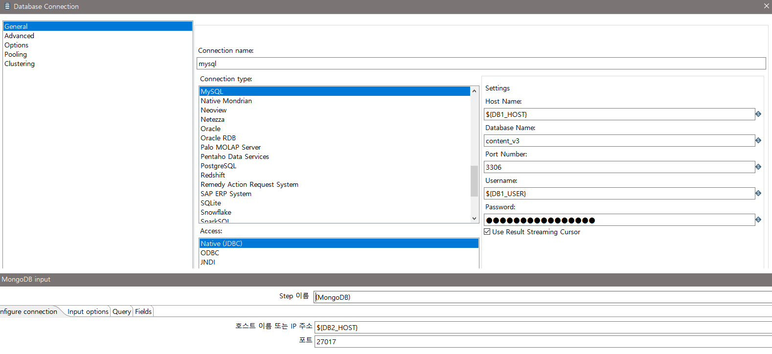 - 다음으로는 ktr파일의 DB Connection으로 가셔서, 1번에서 설정한 변수로 값들을 변경해 줍니다.
