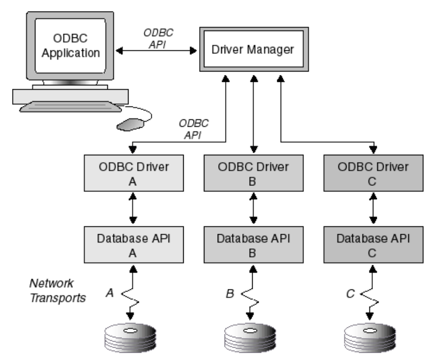 Driver Manager: 드라이버 관리자는 응용 프로그램과 드라이버 간의 통신을 관리하는 라이브러리입니다. 드라이버 관리자는 주로 응용 프로그램 작성자의 편의로 존재하며 모든 응용 프로그램에서 공통되는 여러 가지 문제를 해결합니다. 여기에는 데이터 원본 이름에 따라 로드할 드라이버를 결정하고, 드라이버를 로드 및 언로드 하고, 드라이버의 함수를 호출하는 것이 포함됩니다.