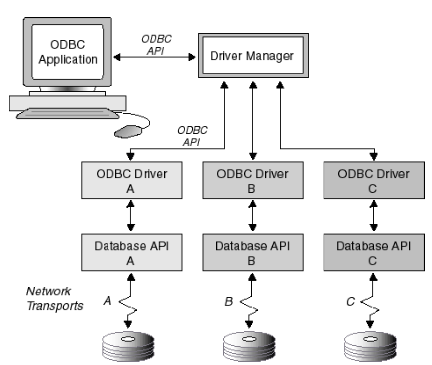 즉, 어떠한 DB 규격이든 간에 ODBC API에 맞추라는 것이었다. 그렇게 하여, 우리가 알고 있는 많은 DB들( MYSQL, MSSQL,...) 은 이 ODBC 규격에 따라, 자신들의 DB로의 통신 규격인 DATABASE API를 컨트롤하는 DRIVER를 만들어내게 되는데, 이를 ODBC Driver라고 한다. 예를 들어, MYSQL ODBC Driver, MSSQL ODBC Driver 등이 있다.