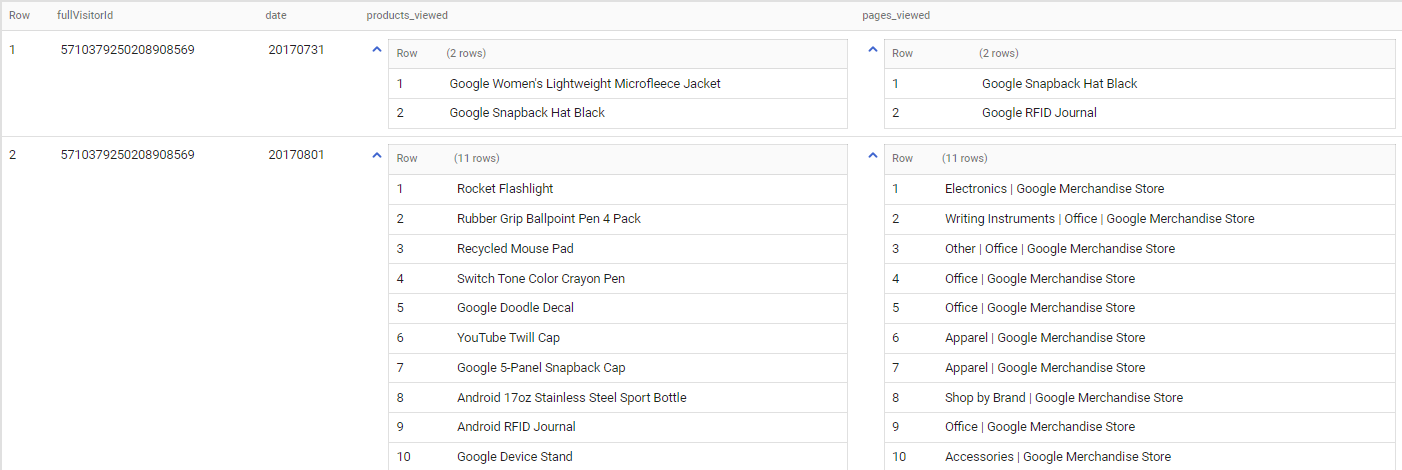 ARRAY_AGG(DISTINCT v2ProductName) AS products_viewed,